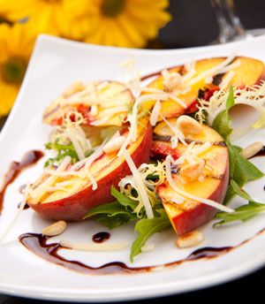 Preheat grill to medium. Cut peaches in half, remove pit and slice fruit into wedges. Brush both sides with olive oil and grill until they have light to medium grill marks on each side (about 3-4 minutes a side). Place salad greens on plates and top with peaches, cheese and pine nuts. Drizzle with balsamic reduction and serve. Makes 4-6 servings.