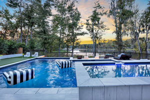 However, the river isn’t the only water feature that Kelly and Aaron enjoy when they’re at home. Their hot tub, which holds 14 people, has a waterfall that spills into the heated, saltwater pool.